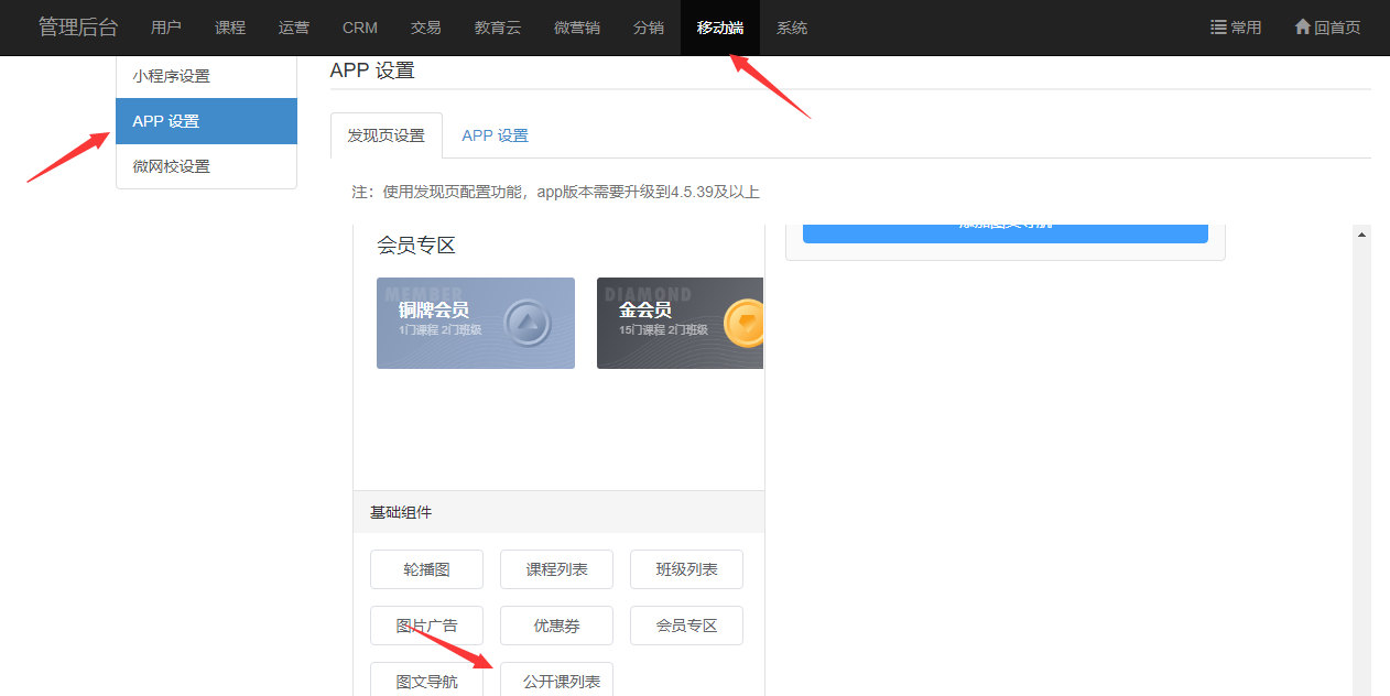 app中未设置公开课组件,操作路径:【管理后台】-【移动端】-【APP设置】。
