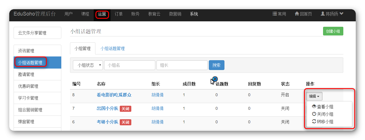 可以,创建者为小组组长,需要管理员或超级管理员操作,在【管理后台】-【运营】-【小组管理】转移给用户,即为组长。