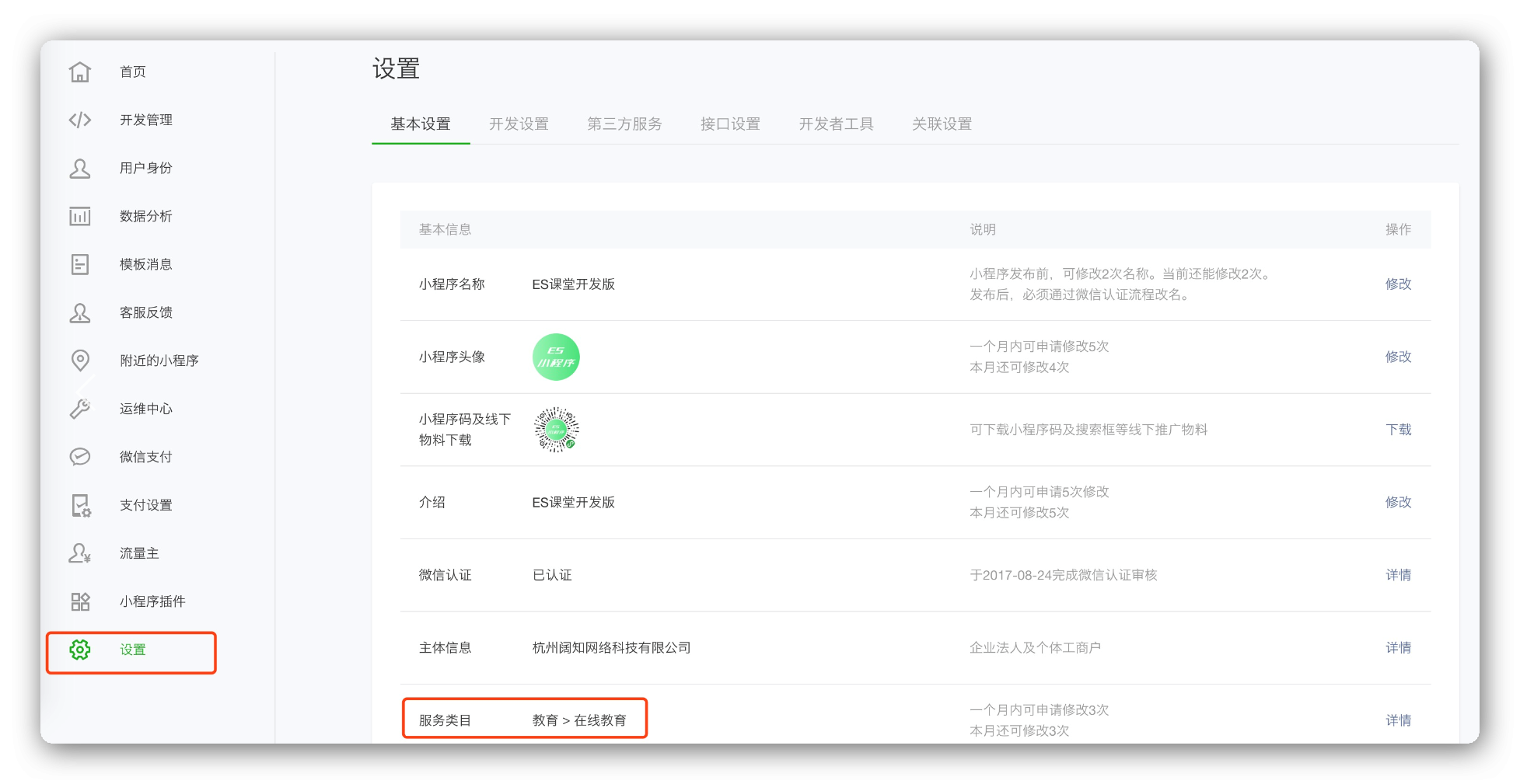 在微信审核过程中,服务类目审核是最重要的一个环,请设置您的服务类目为教育-在线教育 ,设置其他的服务类目可能导致审核不通过。 路径:【设置】-【基本设置】-【服务类目】。
