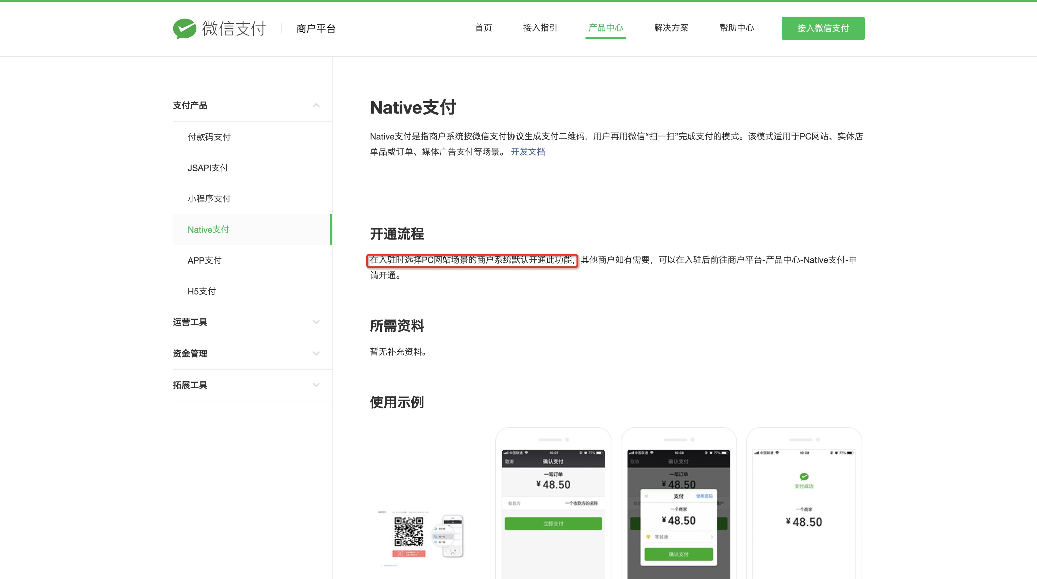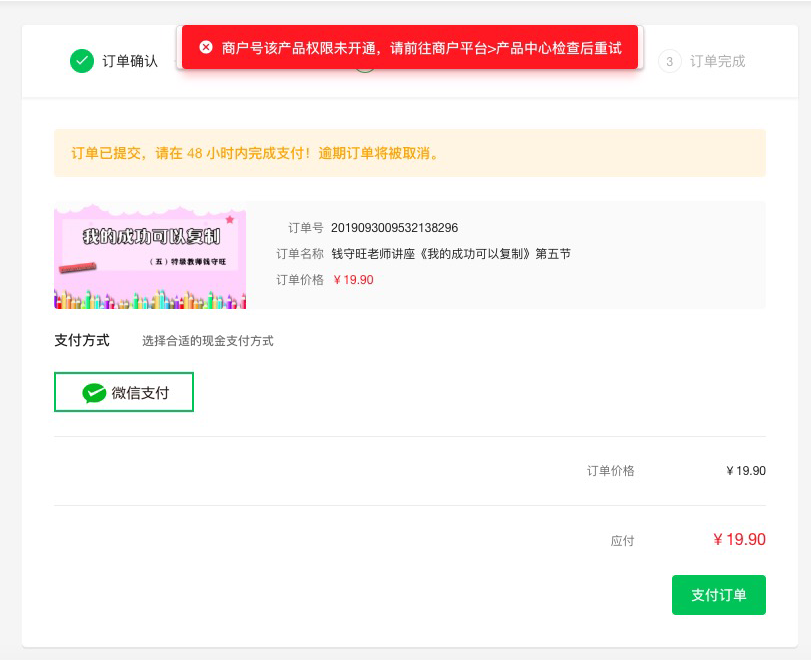 PC端微信支付提示:商户号该产品权限未开通,请前往商户平台>产品中心检查后重试