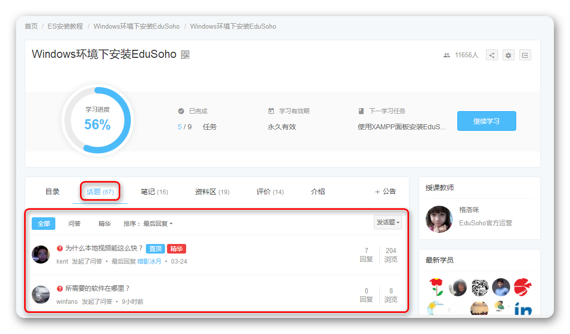 课程话题显示在【计划详情页】-【话题】,只有加入了课程,才能看到课程话题。