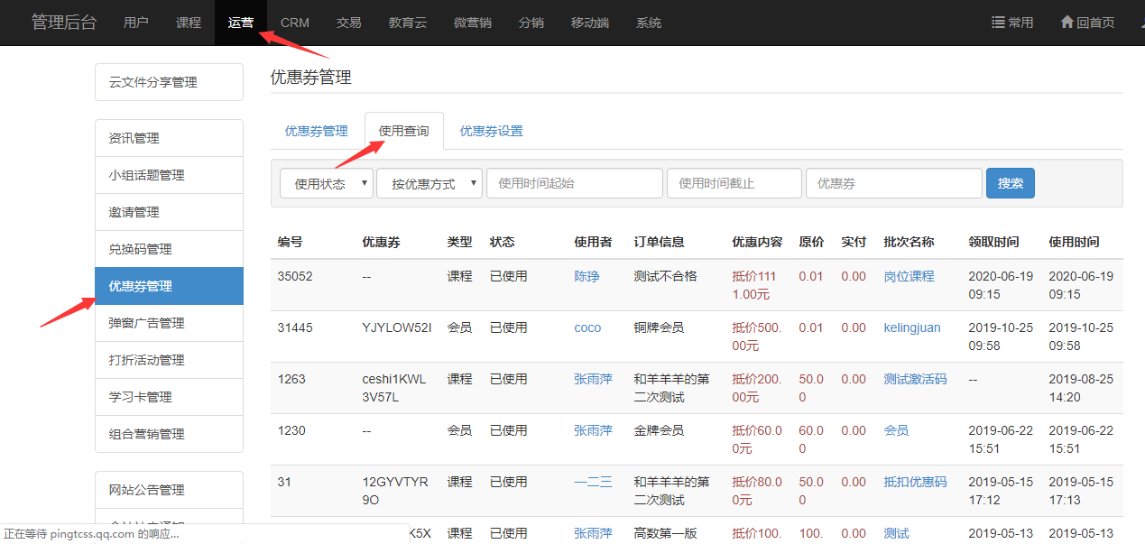 路径:【管理后台】-【运营】-【优惠券管理】-【使用查询】