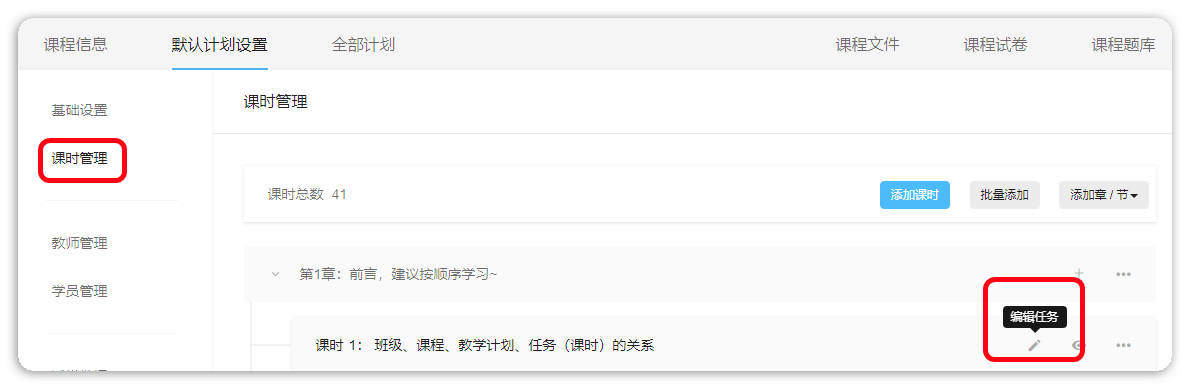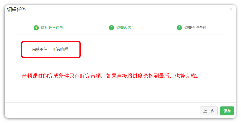 每个课时的完成条件都需要单独设置,编辑课时,第三步即可设置完成条件。