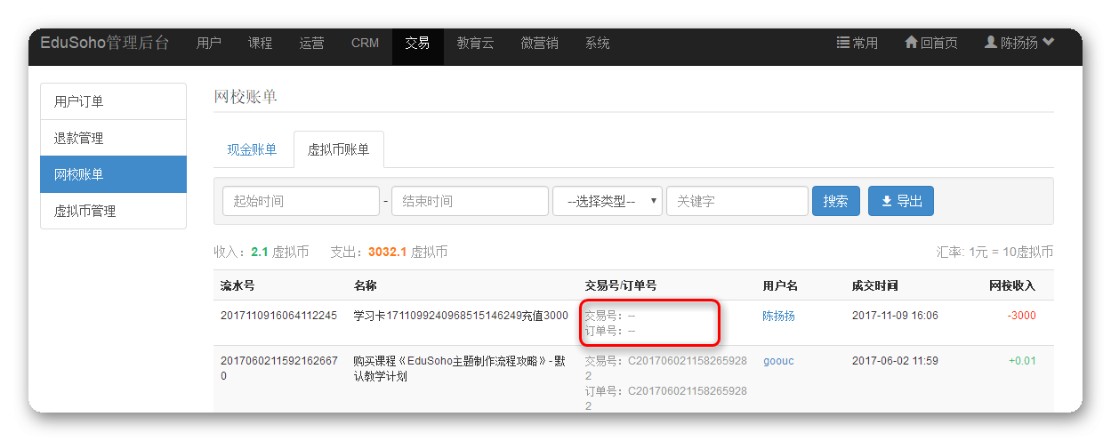 学习卡充值无订单号和交易号,学习卡只能用于虚拟币充值。