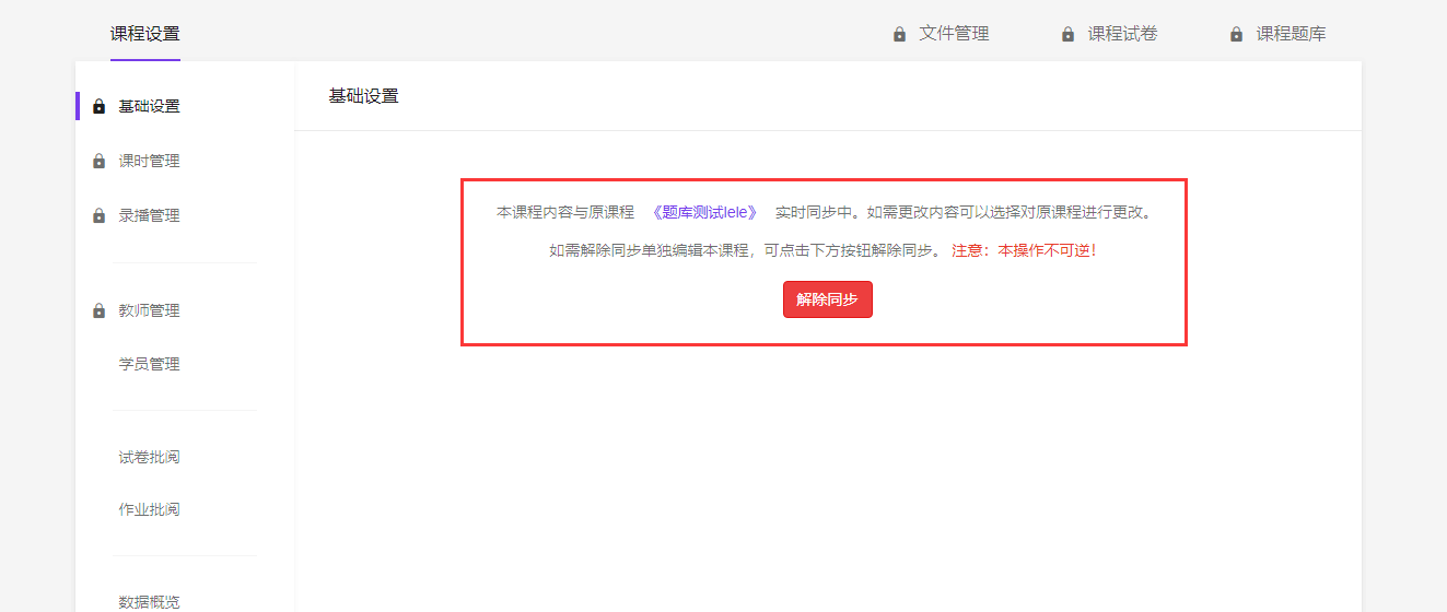 A课程是原课程,B课程是班级课程,B课程的课程设置中,如果解除和A课程的同步,解除后,A课程更新,B课程不变。 解除同步不可逆,一旦解除,技术上也无法恢复同步,请谨慎操作。