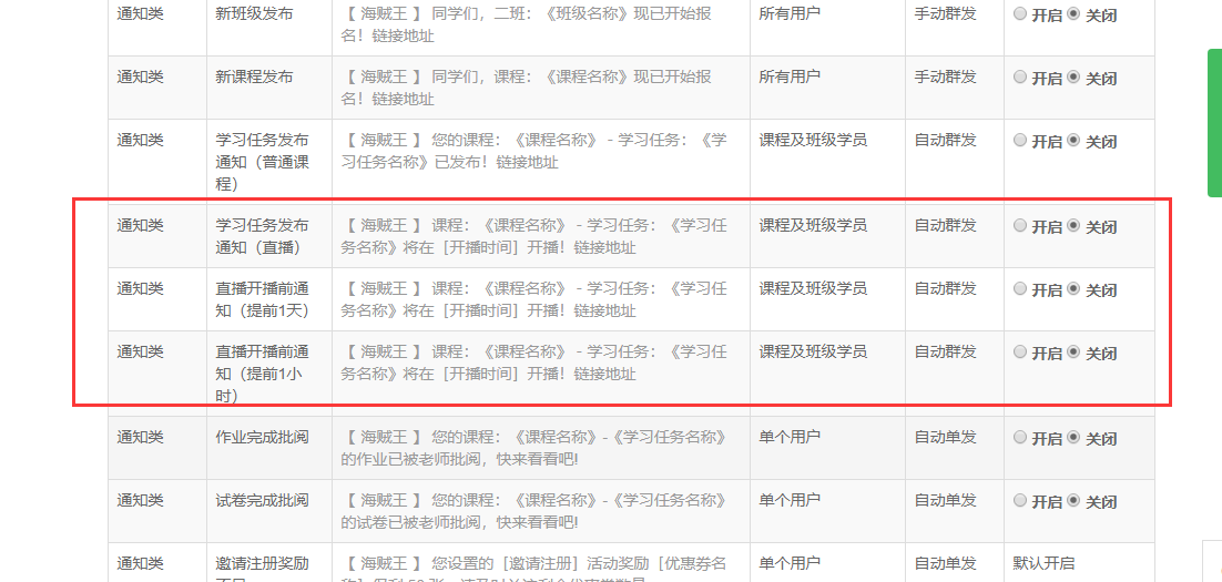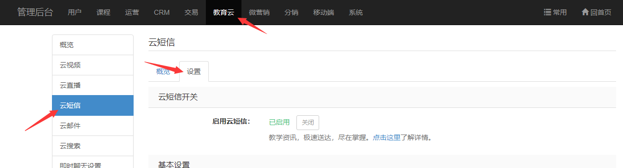 在【管理后台】-【系统】-【教育云】-【云短信】-【设置】-【模板设置】中开启直播短信通知。