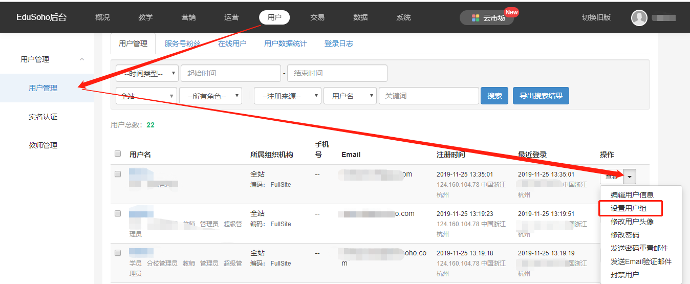 路径:【管理后台】-【用户】-【用户管理】; 先根据用户名/邮箱/手机号或者其他条件,找到要设置的用户,然后点击【设置用户组】,勾选权限后保存即可。