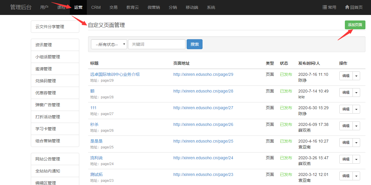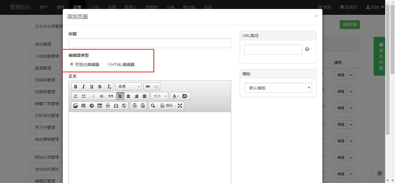 路径:【管理后台】-【运营】-【自定义页面管理】-【添加页面】中编辑器类型选择HTML编辑器即可。