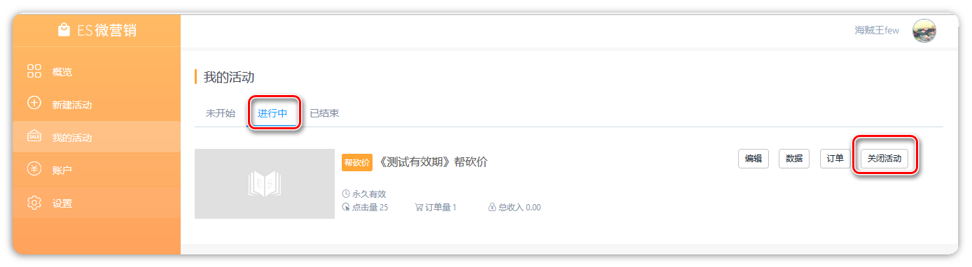1、所有进行中的活动都展现在“进行中”列表内,网站可以手动点击“结束活动”,强制中止活动,活动一旦关停,将不能重新开始,同时学员所有未付款的订单,都需以课程原价(创建时的课程价格)购买;