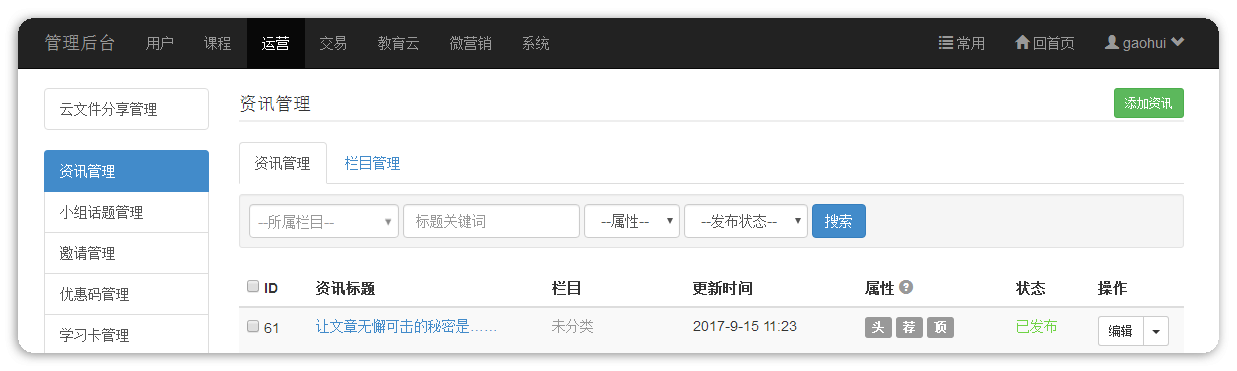 说明:只有管理员以上的权限才能发布资讯,学员和教师没有权限。
