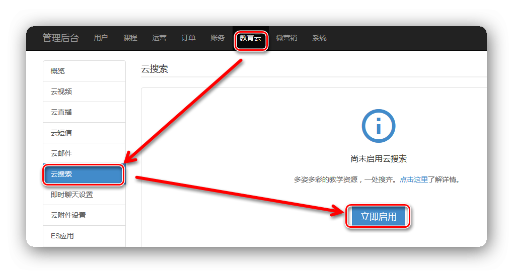 可以,路径:【管理后台】-【教育云】-【云搜索】开启即可。 开启前提:网站必须接入Edusoho教育云。