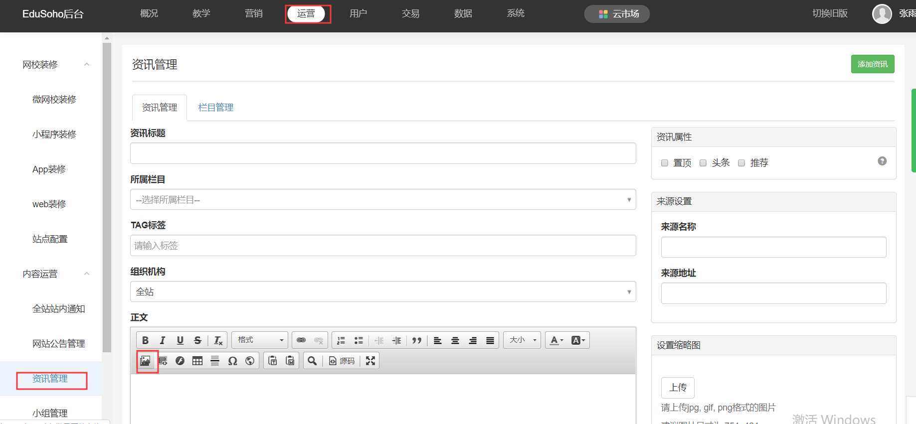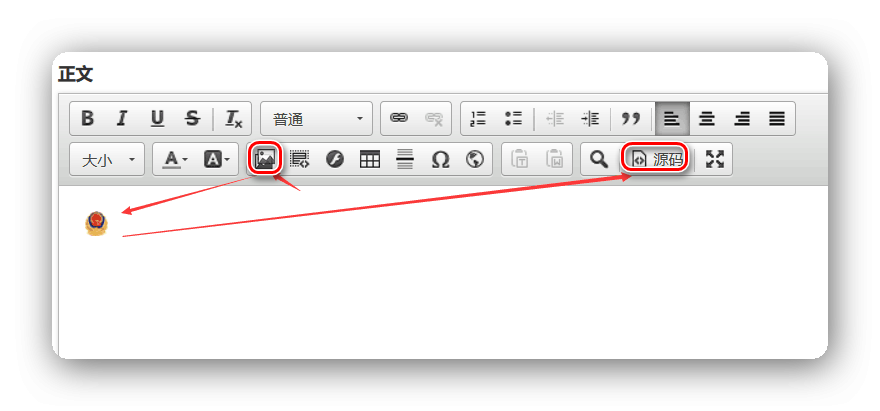 2、随意进入一个可以上传图片的地方,例如资讯编辑界面,上传备案图标的图片之后,点击源码可得到一串地址