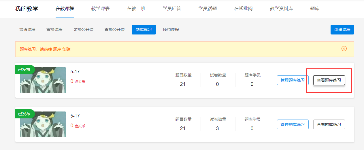 4.【我的教学】-【在教课程】-【题库练习】-【查看题库练习】
