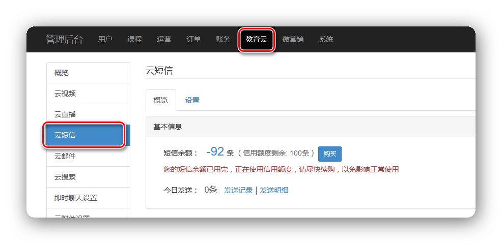 网站【管理后台】-【教育云】-【云短信】-【概览】,可查看短信的“发送明细”和“发送记录”;