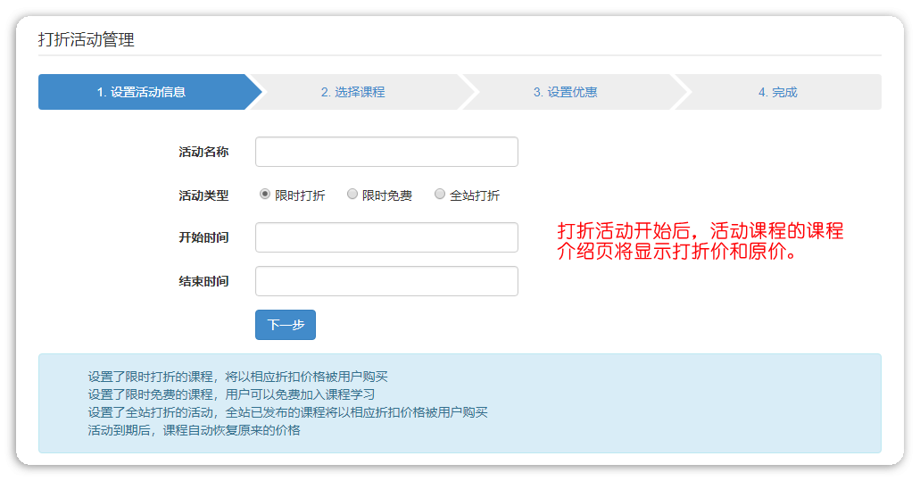 设置活动名称和时间,选择课程,活动开始后,课程的介绍页将显示活动名称和活动价格,首页不显示原价与优惠价,课程的图片上会有“打折”标签。
