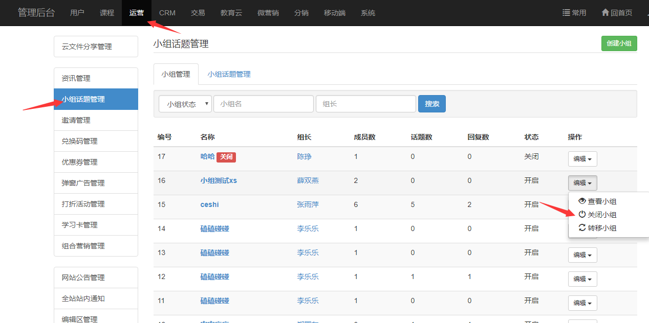 小组不支持删除,但是可以转移或关闭; 路径:【管理后台】-【运营】-【小组话题管理】。