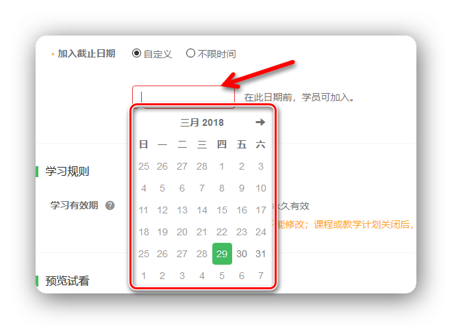 1、自定义:即是网校可自定义学员加入课程的截止日期。假设加入截止时间为2018-12-10,则学员在2018-12-10前可以加入该课程,在 2018-12-10无法加入该课程。