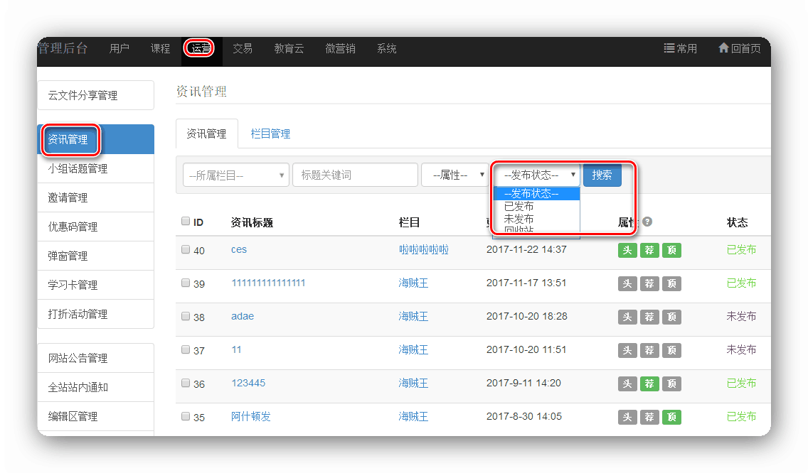 路径:【管理后台】-【运营】-【资讯管理】-【发布状态】