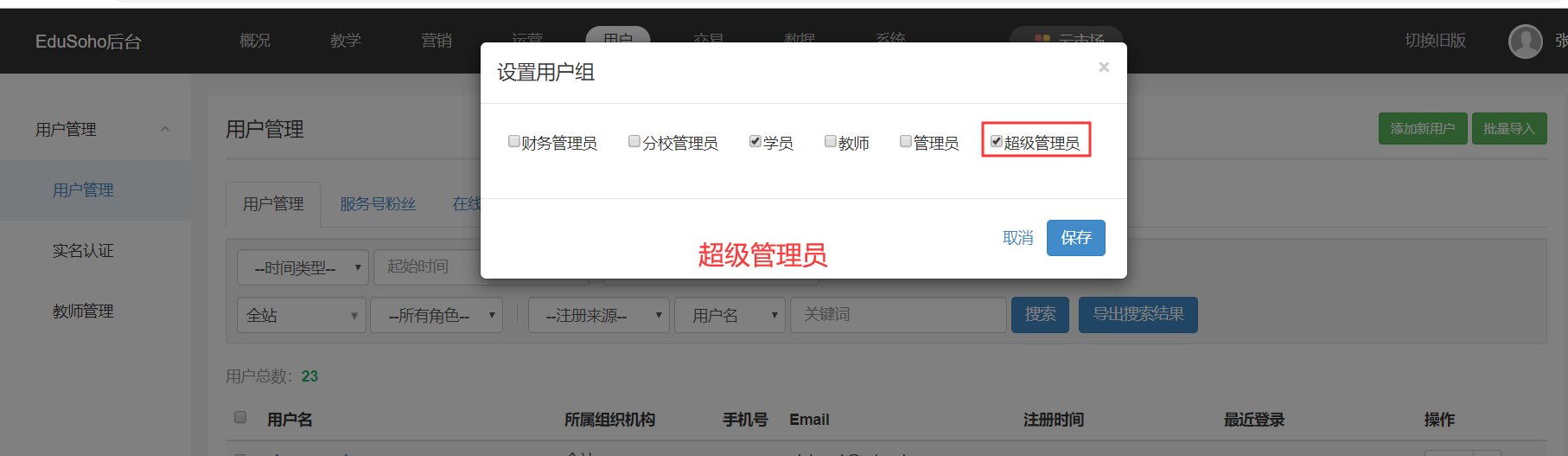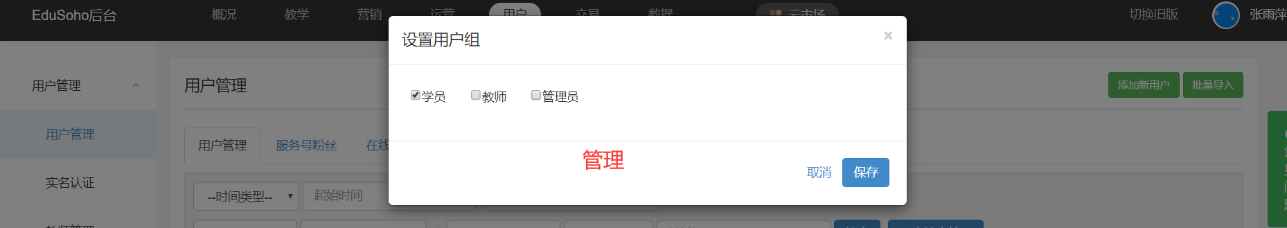 路径:【管理后台】-【用户】-【用户管理】-【设置用户组】;