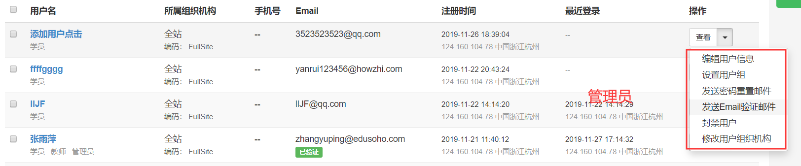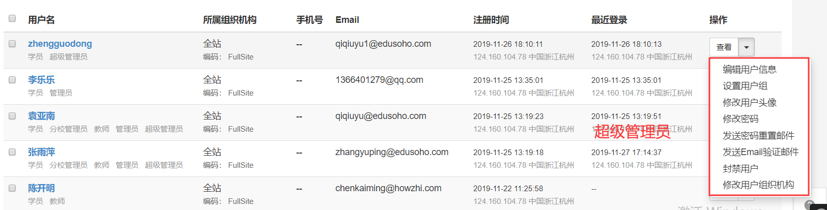 路径:【管理后台】-【用户】-【用户管理】-【操作】;