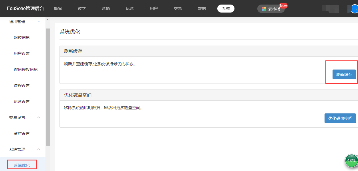 路径:【管理后台】-【系统】-【系统优化】-【刷新缓存】。