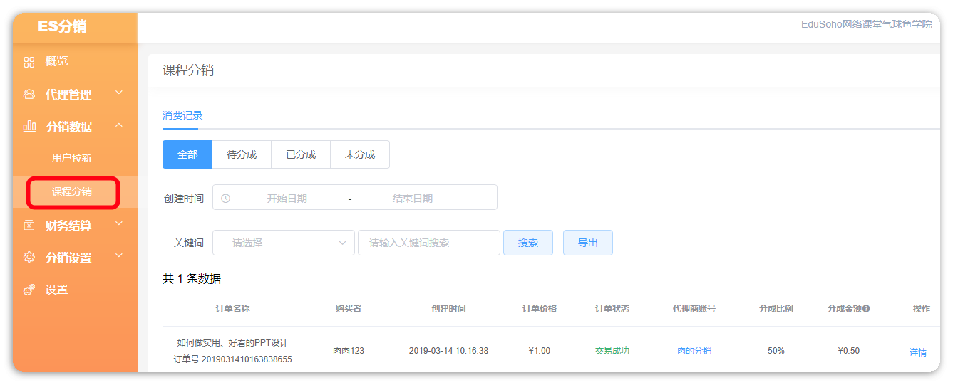在网校购买课程提交订单成功付款后,一小时内数据会同步到消费记录中。