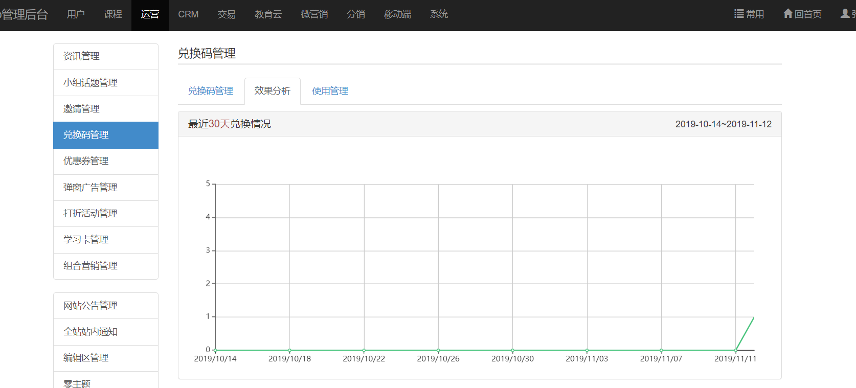 2) 分析使用效果a) 进入兑换码管理,点击【效果分析】,分析最近 30 天,90 天,一年的使用情况;