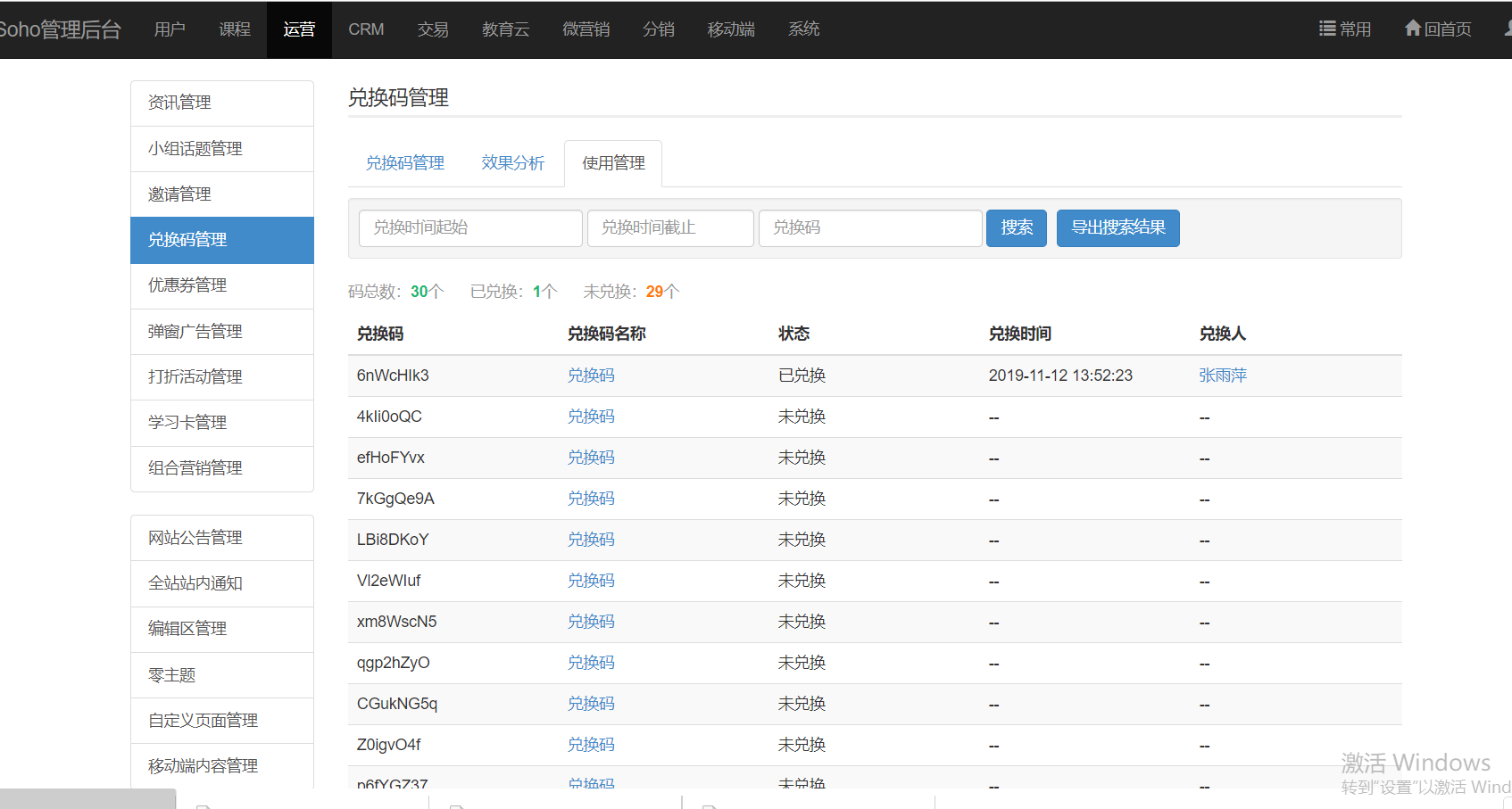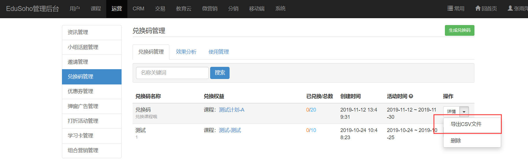 一、 功能介绍兑换码,是由一串数字或字母的组合,用户可使用兑换码去兑换网校课程。网校可通过其它流量平台售卖兑换码、线下发放兑换卡等方式,将兑换码发送给用户。二、 场景示例某网校想要拓宽自己的销售渠道,使用兑换码功能,将课程加入到兑换码中,放在.天猫店铺内售卖,用户获得兑换码即可兑换网校课程,网校借助.天猫平台的流量为网校引流,提高销量。(备注:.店铺会以卡密方式来售卖兑换码,为提高店铺发货效率,店铺可设置.自动发货,具体操作,请参考以下方式:https://jingyan.baidu.com/article/a948d651c2032c0a2dcd2eda.html)1) 生成并导出兑换码a) 进入 ES 管理后台点击【运营】-【兑换码管理】进入兑换码列表页;