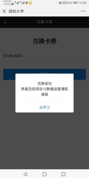 b) 进入兑换码管理,点击【使用管理】,可搜索、查看、导出、分析网校兑换码详细使用数据。3) 用户兑换效果针对不同使用场景,给网校提供以下兑换方式:a) 用户打开阔知学堂 APP 点击【兑换卡券】,输入兑换码,即可兑换。