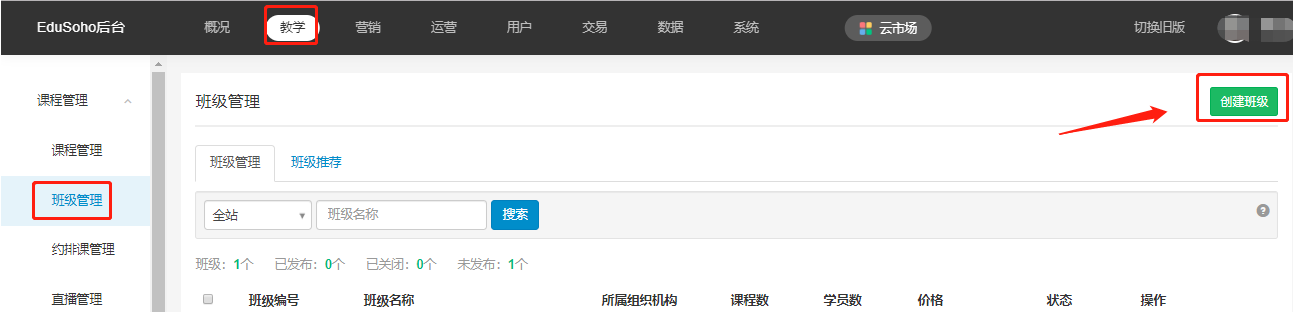 路径:【管理后台】-【教学】-【班级管理】,右上角创建班级。