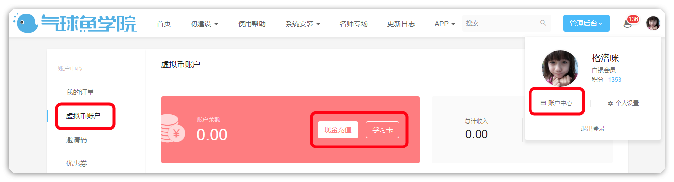 2、学员直接充值,网校需安装账户充值应用,然后在【管理后台】-【系统】-【账务设置】-【充值】开启;