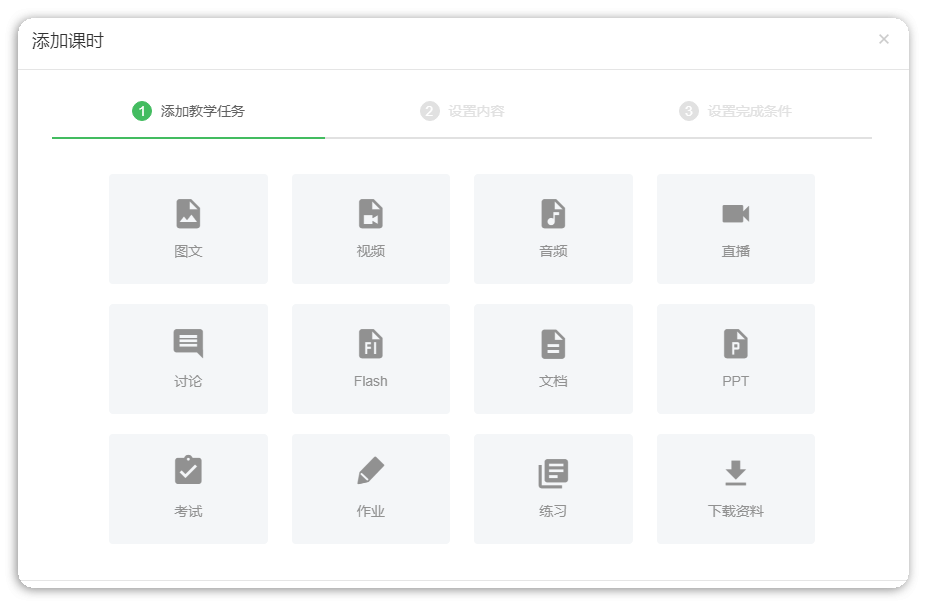 十二种类型:图文、视频、音频、直播、讨论、Flash(swf)、文档(PDF/Word/Excel)、PPT、考试、作业、练习、下载资料。