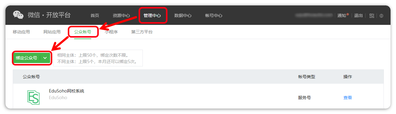 解决办法:登录微信开放平台,找到【管理中心】-【公众账号】-【绑定公众号】,根据提示操作,绑定成功即可。
