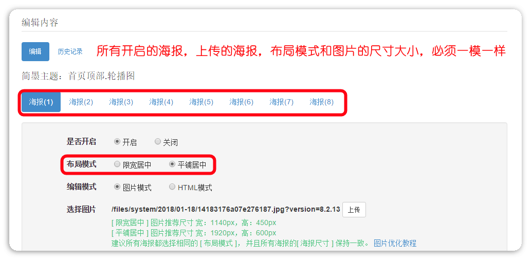 B、布局模式:限宽居中尺寸建议1140×450px;平铺居中尺寸建议1920×600px;