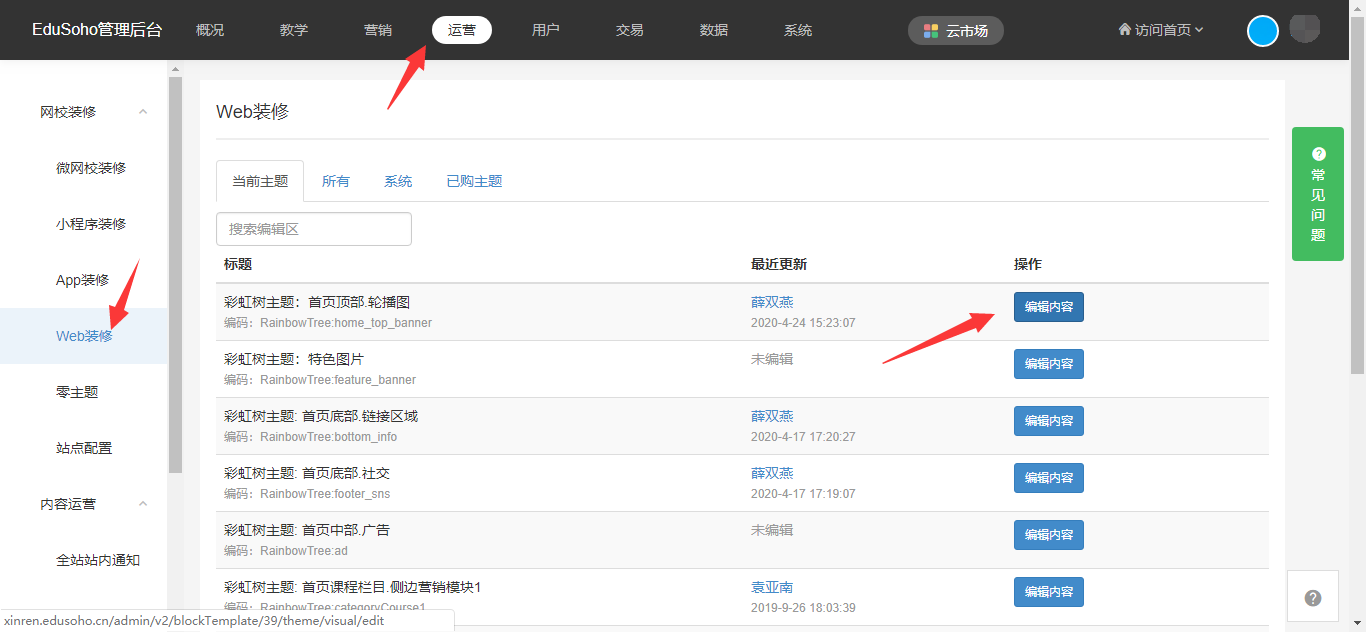 路径:【管理后台】-【运营】-【web装修】-【当前主题】顶部轮播;网站使用哪个主题,就修改哪个主题的顶部轮播,否则修改不生效。