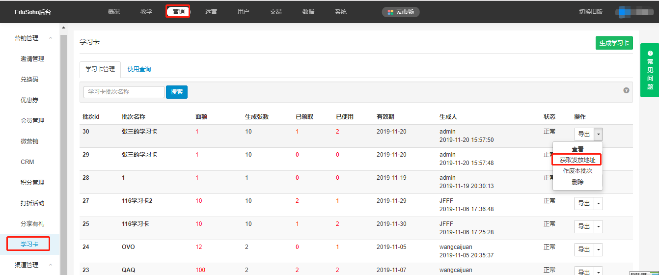 路径:【管理后台】-【营销】-【学习卡管理】-【获取发放链接】,将连接发送给学员,学员打开链接即可领取学习卡。