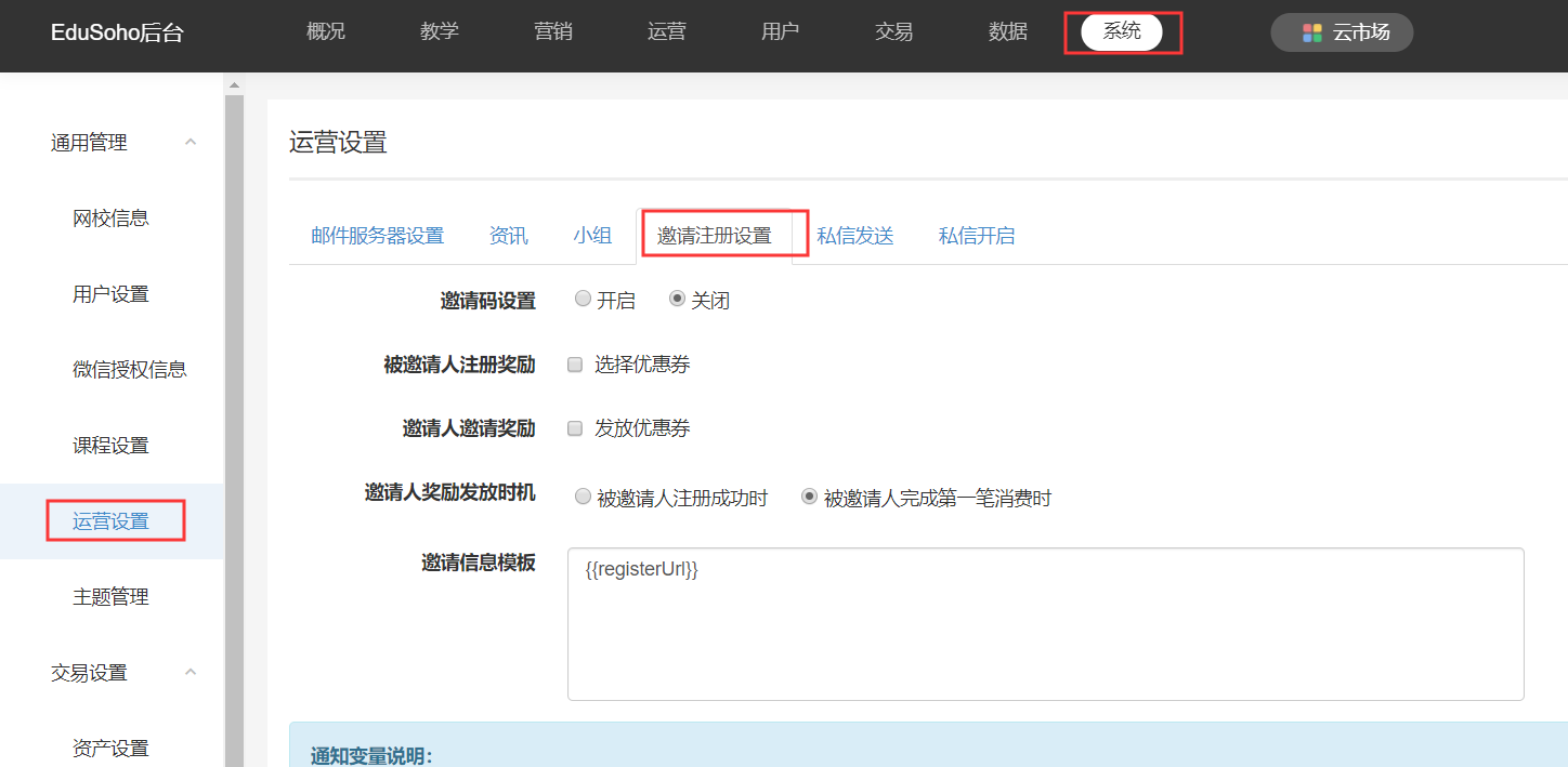 路径:【管理后台】-【系统】-【运营设置】-【邀请注册设置】