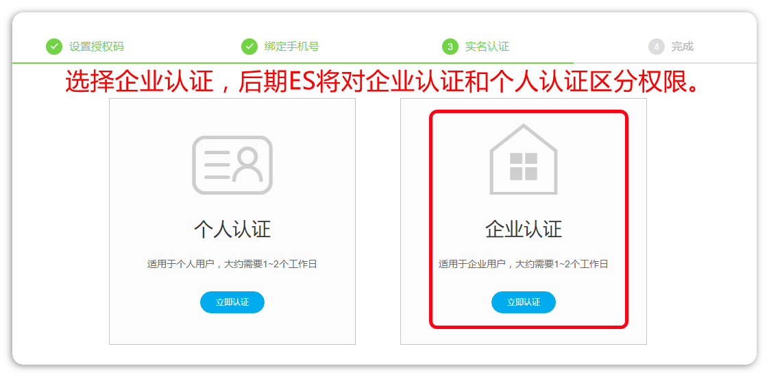【个人认证】和【企业认证】二选一,建议使用企业认证,后期ES将对企业认证和个人认证的账号做权限区分。