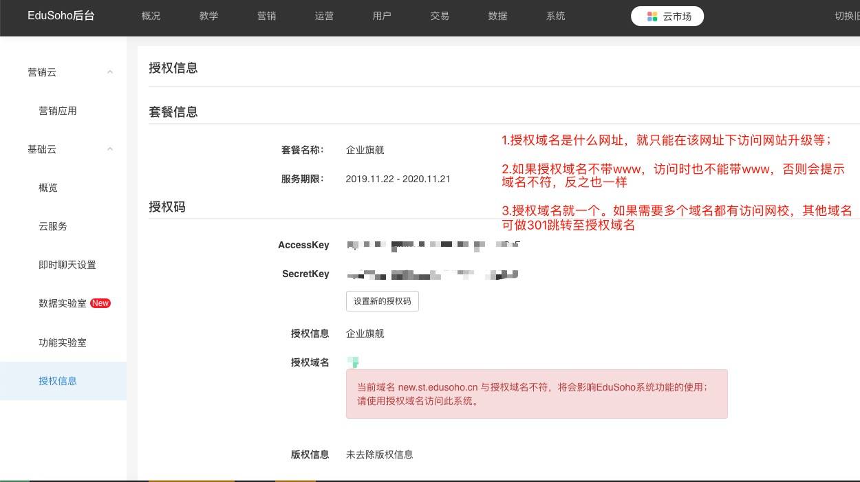 1、如果是升级系统或者【管理后台】-【云市场】-【授权信息】中提示”授权域名不符“,请以【授权信息】中的域名访问网校,如果域名有变更,商业客户可联系运营人员,开源版域名绑定后就不再支持自行更换,如需更换,请联系客户经理或官网在线客服。