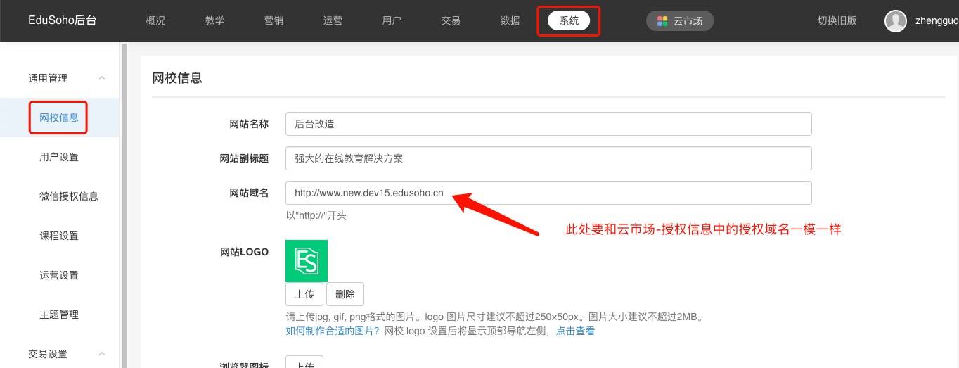 2、如果是管理后台首页提示“授权域名不符”,请在【管理后台】-【系统】-【网校信息】-【网站域名】中修改域名。