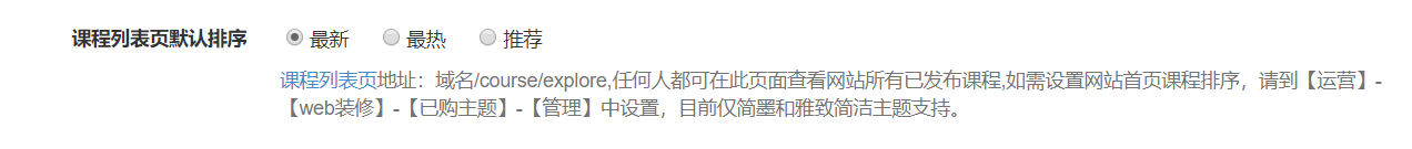 1、如果需要调整首页课程排序,请到【管理后台】-【运营】-【web装修】-【当前主题】中设置,目前官方主题仅简墨和雅致简洁主题进行排序;