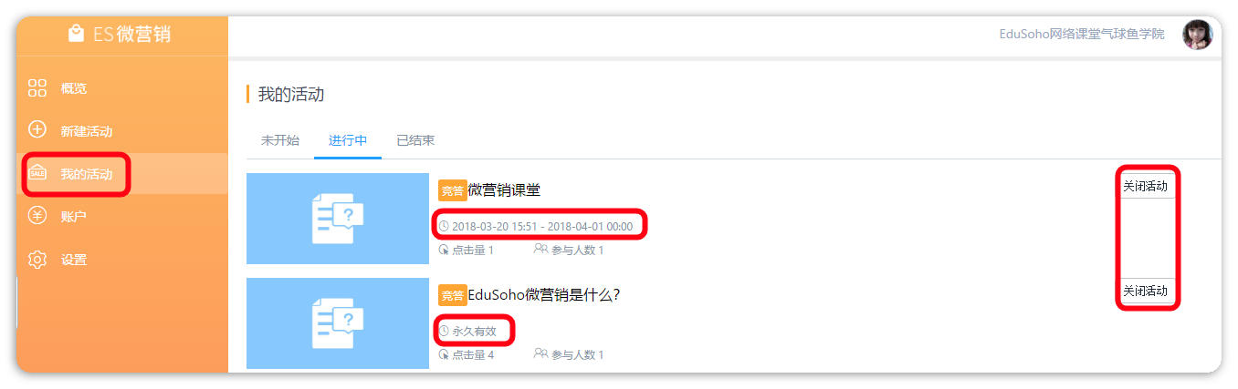 直接在【微营销】-【我的活动】中关闭活动即可。
