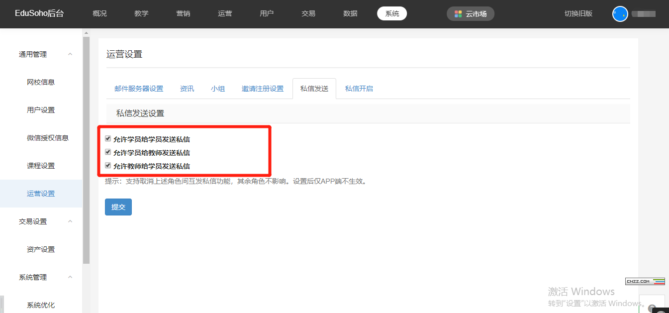 1、即使全部选项去除勾选,学员和管理员之间也可以正常互发私信。