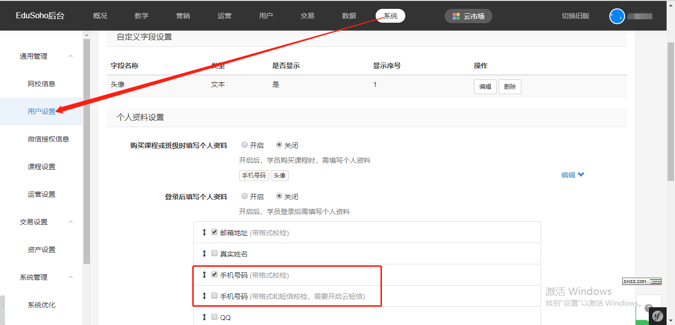 设置路径:【管理后台】-【系统】-【用户设置】-【用户信息设置】。