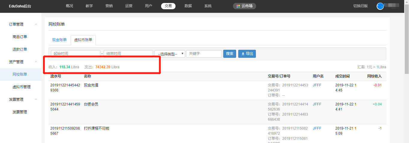 收入是指用户通过虚拟币消费后,网校收入的虚拟币金额;