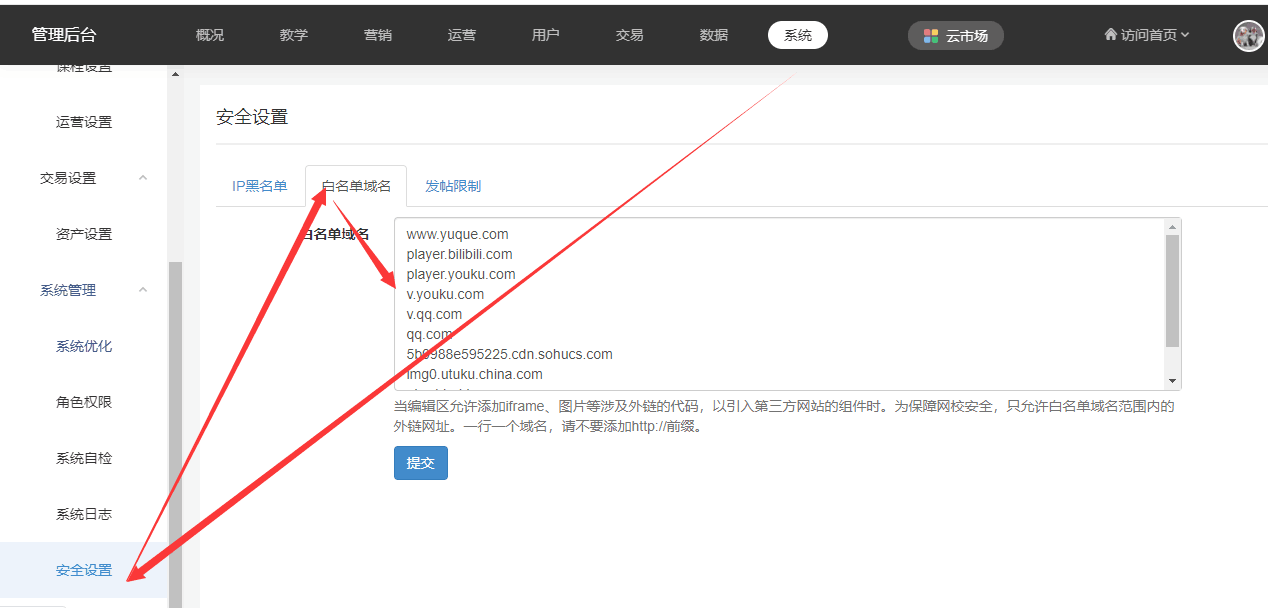 第一步:在三个网站(优酷,腾讯,网易公开课)中复制通用代码 第二步:把代码复制到图文可是的源码段 第三步:后台设置下白名单