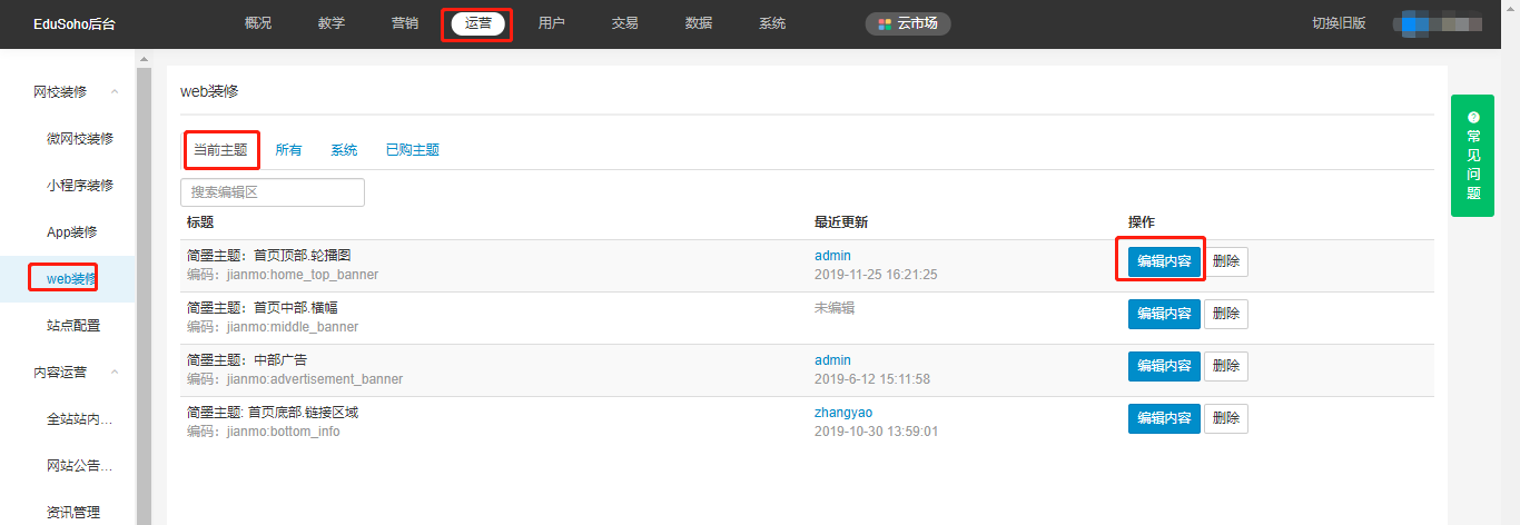 路径:【管理后台】-【运营】-【web装修】-【当前主题】顶部轮播;网站使用哪个主题,就修改哪个主题的顶部轮播,否则修改不生效。