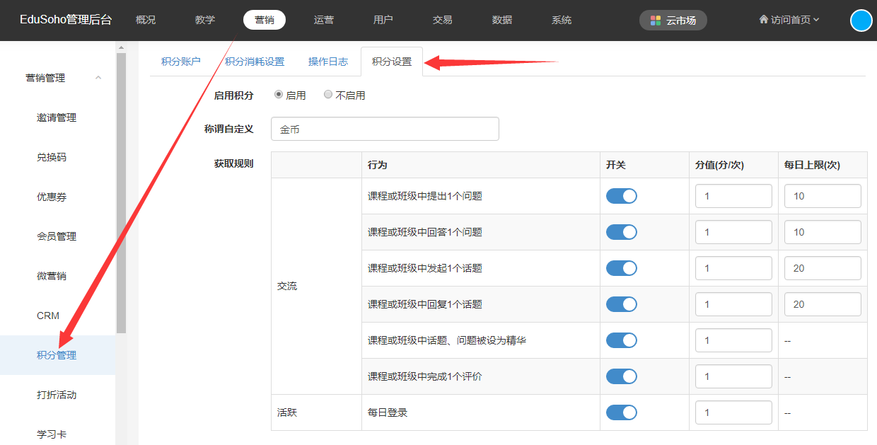 路径:【管理后台】-【营销】-【积分管理】-【积分设置】