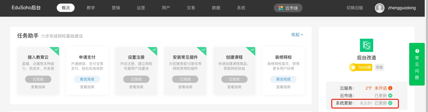 进入【管理后台】-【教育云】-【ES应用】-【已购应用】中,找到【EduSoho主系统】,可以查看系统版本号。