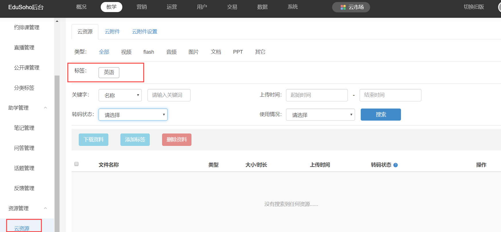 在ES系统中,通过“标签”进行分类管理,“标签”在【管理后台】-【教学】-【分类标签】-【标签管理】中添加,在【云资源】或者【教学资料库】中编辑资料时,可以给资料打标签,之后通过标签可查询所有有这个标签的资料。